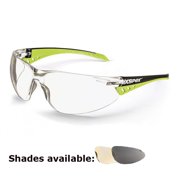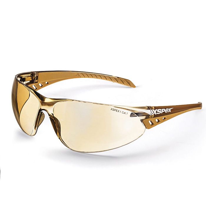 XSpex safety glasses , wraparound style, soft rubber sidearms, anti-fog and anti-scratch coating.