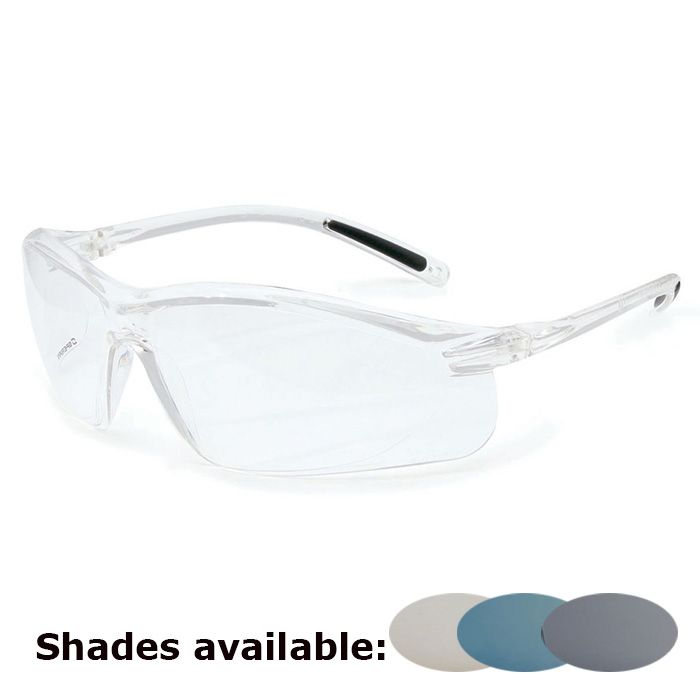 Uvex A700 Series has a 9-base wraparound frame and soft temple pads that offer a secure fit.