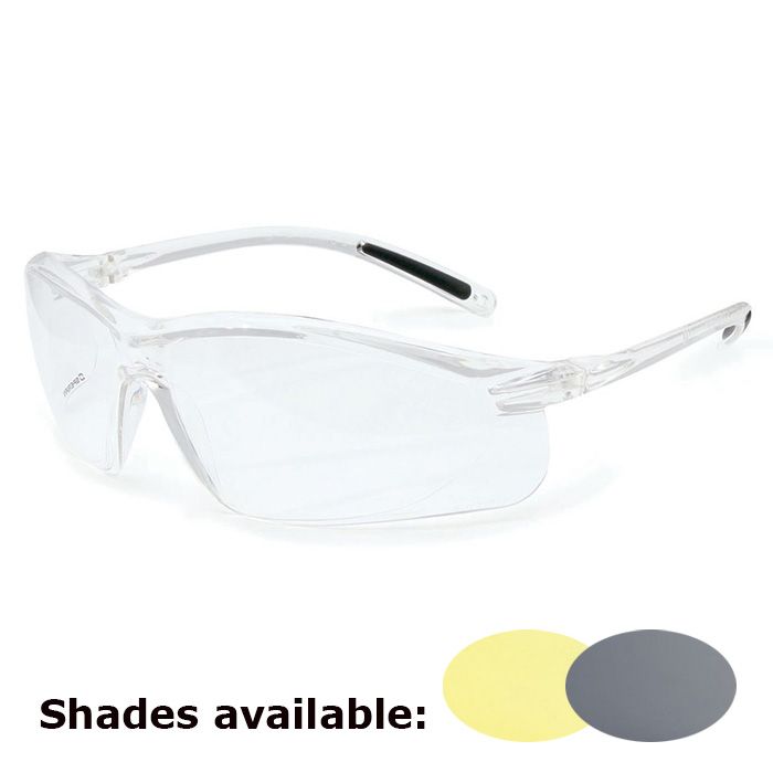 Uvex A700 Series has a 9-base wraparound frame and soft temple pads that offer a secure fit.