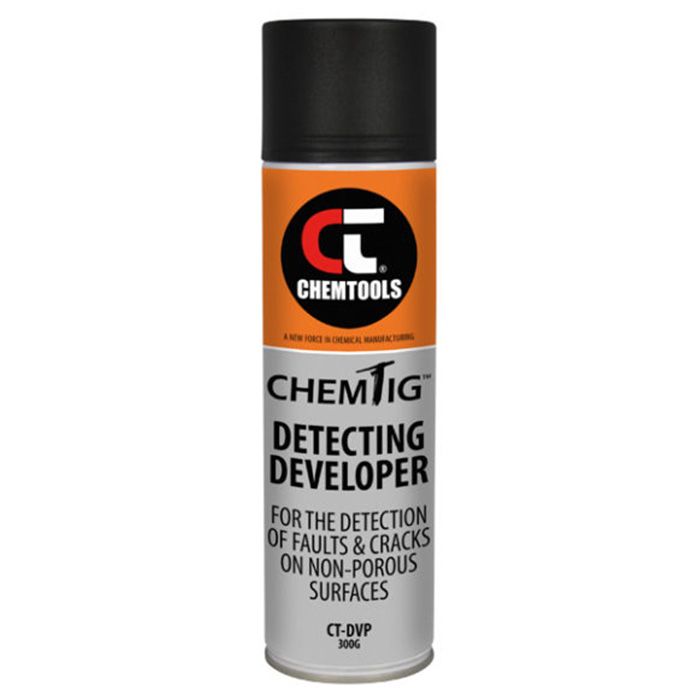 It is applied as a final coating after surfaces have been prepared with ChemTig Prep-Solv Metal Cleaner & Degreaser, and ChemTig Red Dye Penetrant, whereby it develops and reveals microscopic cracks and flaws by pulling the entrapped penetrant to the surface by capillary action.