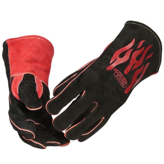 Additional thumb pad in high wear area increases glove life. The black split cow hide with red flame pattern adds a sense of style.